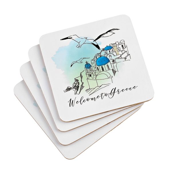 ΣΟΥΒΕΡ ΤΕΤΡΑΓΩΝΑ ΜΕ ΦΕΛΛΟ ΣΕΤ 4 ΤΕΜΑΧΙΩΝ ΓΛΑΡΟΙ ”WELCOME TO GREECE” 10x10cm