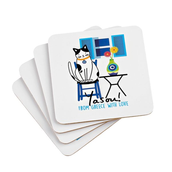 ΣΟΥΒΕΡ ΤΕΤΡΑΓΩΝΑ ΜΕ ΦΕΛΛΟ ΣΕΤ 4 ΤΕΜΑΧΙΩΝ ΓΑΤΟΥΛΑ ”YASOU FROM GREECE WITH LOVE” 10x10cm