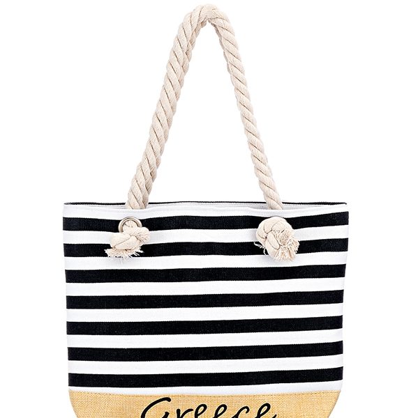 ΤΣΑΝΤΑ ΘΑΛΑΣΣΗΣ ΥΦΑΣΜΑΤΙΝΗ ΛΕΥΚΗ ΜΕ ΜΑΥΡΕΣ ΡΙΓΕΣ ”GREECE” 2 ΟΨΕΩΝ 33x8x26cm