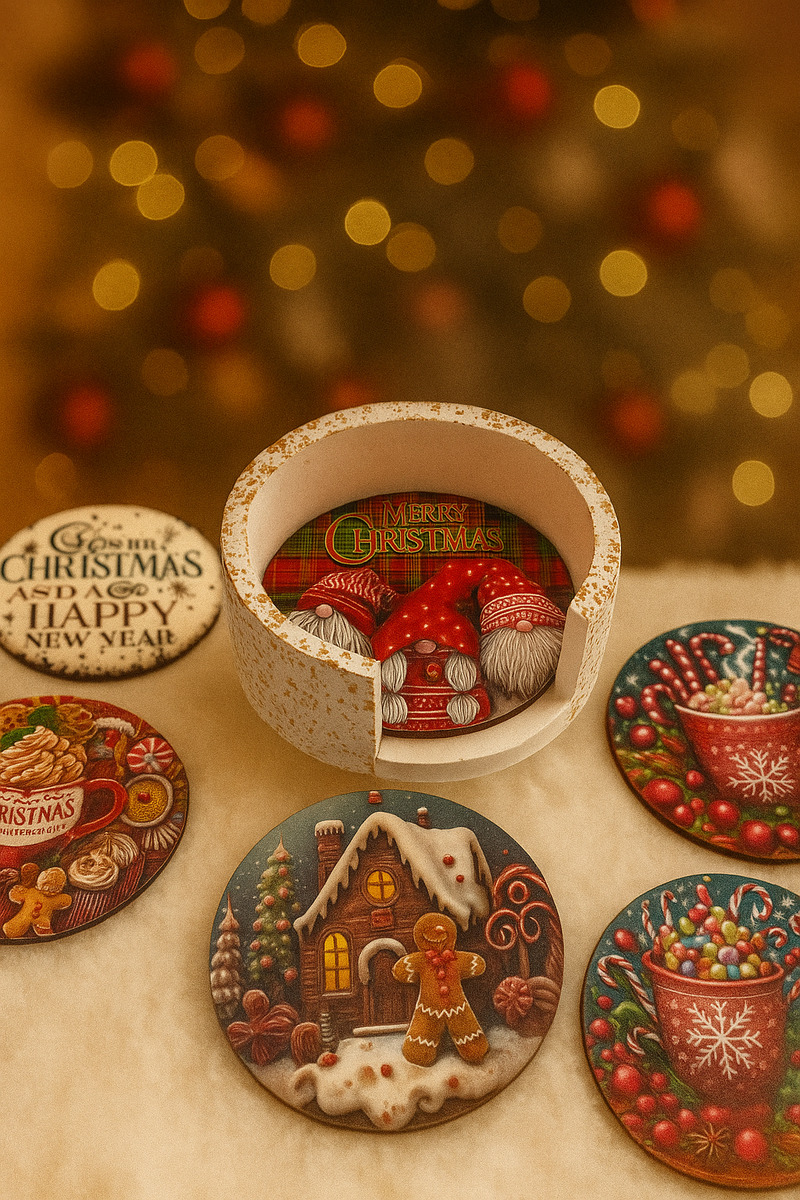 ΣΕΤ 6 ΧΡΙΣΤΟΥΓΕΝΝΙΑΤΙΚΑ ΣΟΥΒΕΡ ΞΥΛΙΝΑ ΜΕ ΚΕΡΑΜΙΚΗ ΒΑΣΗ ΛΕΥΚΗ ΜΕ ΧΡΥΣΕΣ ΠΙΤΣΙΛΙΕΣ Φ10x4cm